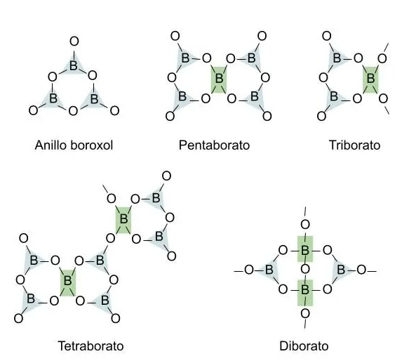 No todo el boro se puede convertir en tetraedros y se forman estructuras de tipo diborato, triborato, tetraborato y pentaborato. Primero se van reemplazando grupos boroxol por grupos pentaborato y triborato, que pueden llegar a unirse para formar tetraboratos, y según aumenta la presencia de modificadores comienzan también a formarse grupos diborato.