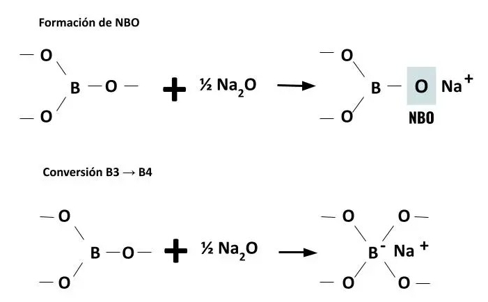 Es decir, la introducción de modificadores genera oxígenos NBO que rompen las cadenas de boro, pero según se van formando oxígenos NBO, es más probable que el boro alcance su estructura tetraédrica convirtiendo NBO’s en BO’s.