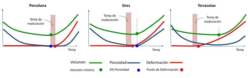 Representación aclaratoria (no real) de curvas de volumen/porosidad/deformación para porcelana/gres/terracota