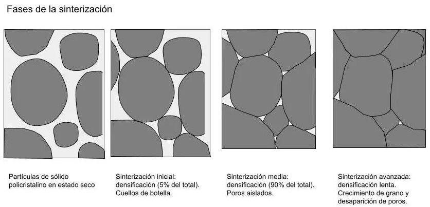 Podemos distinguir 3 etapas o grados de sinterización. El grado de sinterización alcanzado depende de las características del material y de la curva de calentamiento (temperatura alcanzada, velocidad de calentamiento y atmósfera del horno).