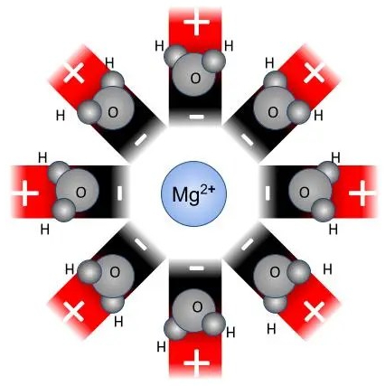 Moléculas dipolares de agua rodeando un ion de magnesio con carga positiva.