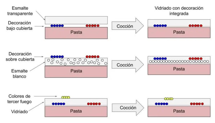 Cuando la decoración se aplica debajo del esmalte hablamos de decoración bajo cubierta, y si se aplica encima del esmalte será decoración sobre cubierta. Lo más habitual es emplear un vidriado transparente cuando se realizan diseños bajo cubierta para poder ver así la decoración realizada. Cuando se realiza decoración sobre cubierta se suele emplear un esmalte blanco sobre el que destacan los diseños realizados, como si se tratase de un lienzo. Pero no siempre es así.