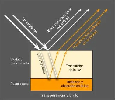 Dependiendo del ángulo de incidencia de la luz, la reflexión en la superficie del vidriado será mayor o menor de forma que percibimos que el vidriado tiene brillo a la vez que sabemos que es transparente porque vemos la superficie de la pasta que está debajo.