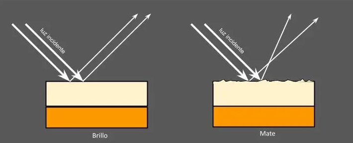 La reflexión de la luz que se produce en la superficie la percibimos como brillo o como mate, con toda la gama de valores intermedios como semi-brillo, satinado, semi-mate, etc… dependiendo de si los rayos reflejados son paralelos o siguen distintas direcciones.