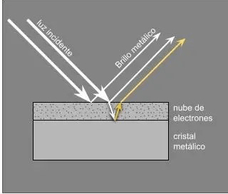Esa nube provoca que la luz incidente se refleje dando lugar al característico brillo metálico. Sin embargo, algunos fotones logran atravesar la capa de electrones libres y algunas frecuencias son absorbidas produciendo las distintas tonalidades de los metales. Así vemos el amarillo dorado del oro, el gris plateado de la plata o el color rojizo metálico del cobre.