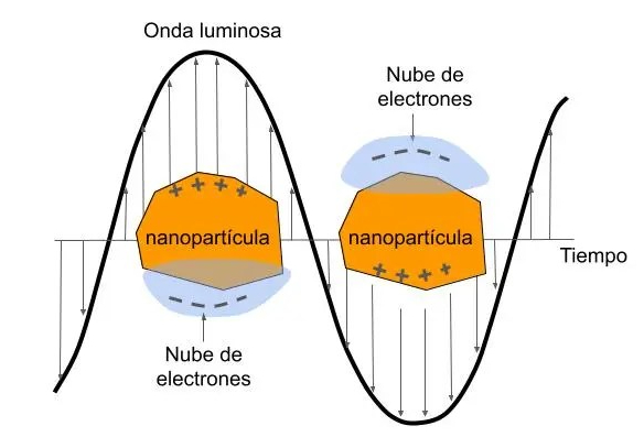 Las nanopartículas metálicas tienen una nube de electrones muy pequeña y cuando incide la luz esa nube se mueve oscilando desde un lado de la nanopartícula hasta el lado opuesto al ritmo de la frecuencia de la luz (esto se denomina plasmón).