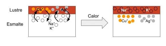 Por ejemplo, si tenemos plata y cobre en la suspensión, se produce el intercambio de iones de Ag+ y/o Cu+ que van desde el lustre resinado y se difunden en el vidriado base, mientras que simultáneamente el vidriado base cede iones Na+ y K+ que van desde el vidriado base a la pasta de lustre.