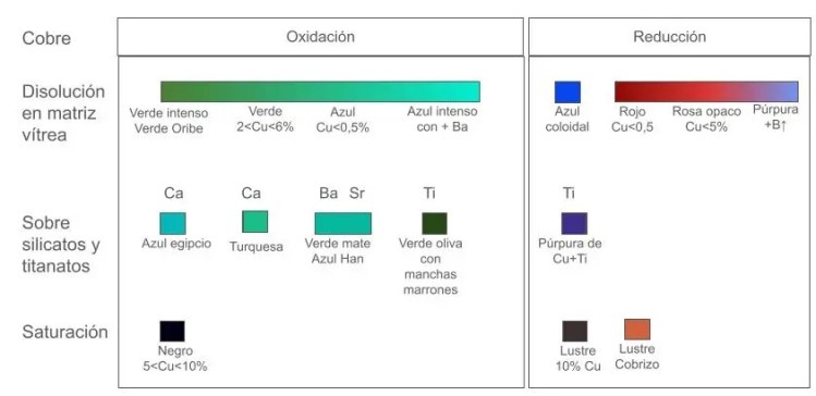 Azul: Solo aparece con muy pequeña cantidad de cobre en el vidriado (menos del 0,5% de cobre), cuando se disuelve totalmente en una cocción oxidante. Aumentando la cantidad de cobre presente y/o la viscosidad del vidriado el color azul se transforma en verde.