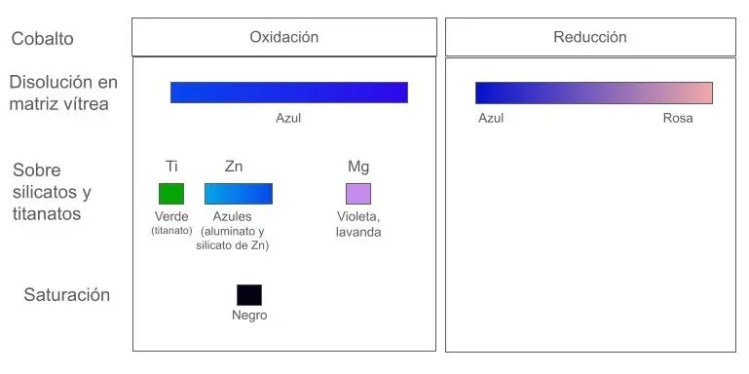 Azul violáceo: Azul violáceo en vidriados que no contienen zinc. El azul se hace oscuro en vidriados ricos en sílice, sobre todo los de plomo.