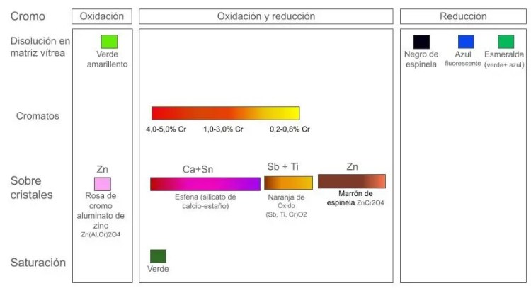 Verdes de cromo: Los cristales de óxido de cromo sin disolver son los responsables del color verde de cromo y basta con un 1% para lograr un verde fuerte. Este verde puede ser verde hierba (con calcio), verde pavo real (con magnesio y cobalto),.. En cocciones fuertemente reductoras se forma verde esmeralda debido a la combinación del verde amarillento con el azul fluorescente de los átomos neutros.
