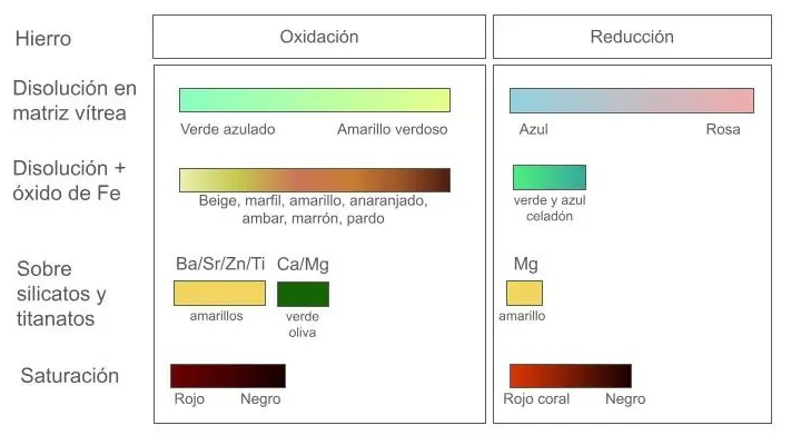 El anión [FeO4]-4 produce color amarillo verdoso. Los iones Fe+2 son incoloros El átomo elemental Fe0 es de color azul. El resultado cuando hay mucho FeO presente es un amarillo verdoso azulado. Por otro lado, la disolución del Fe2O3 libera oxígeno en forma de burbujas a las que se adhiere Fe2O3, si está en saturación, de forma que al llegar a la superficie la burbuja escapa y deja manchas de hierro que son las “manchas de aceite” de los vidriados tenmoku, o los “riachuelos» de los tenmoku piel de liebre.