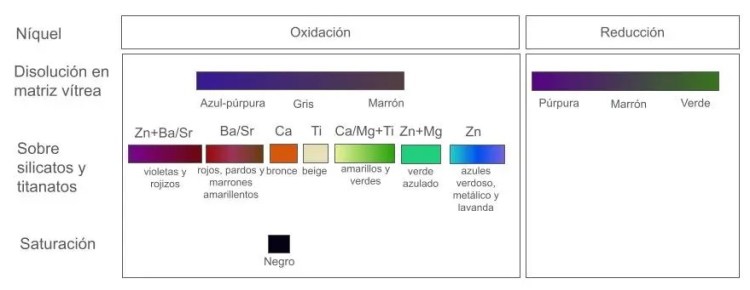 En oxidación, dependiendo de la composición del vidriado y de la solidificación en forma vítrea o cristalina, los colores del níquel pueden ser amarillo, verde, marrón verdoso, marrón, azul, violeta azulado, violeta rojizo, rosa o rojo carmín. Los colores del níquel son: